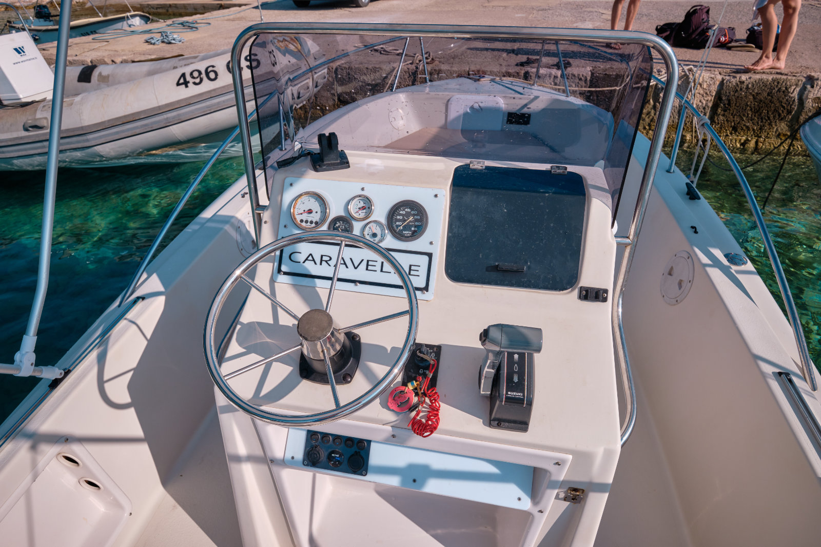 On deck: fishfinder, bimini top, sunbath, stairs, shower