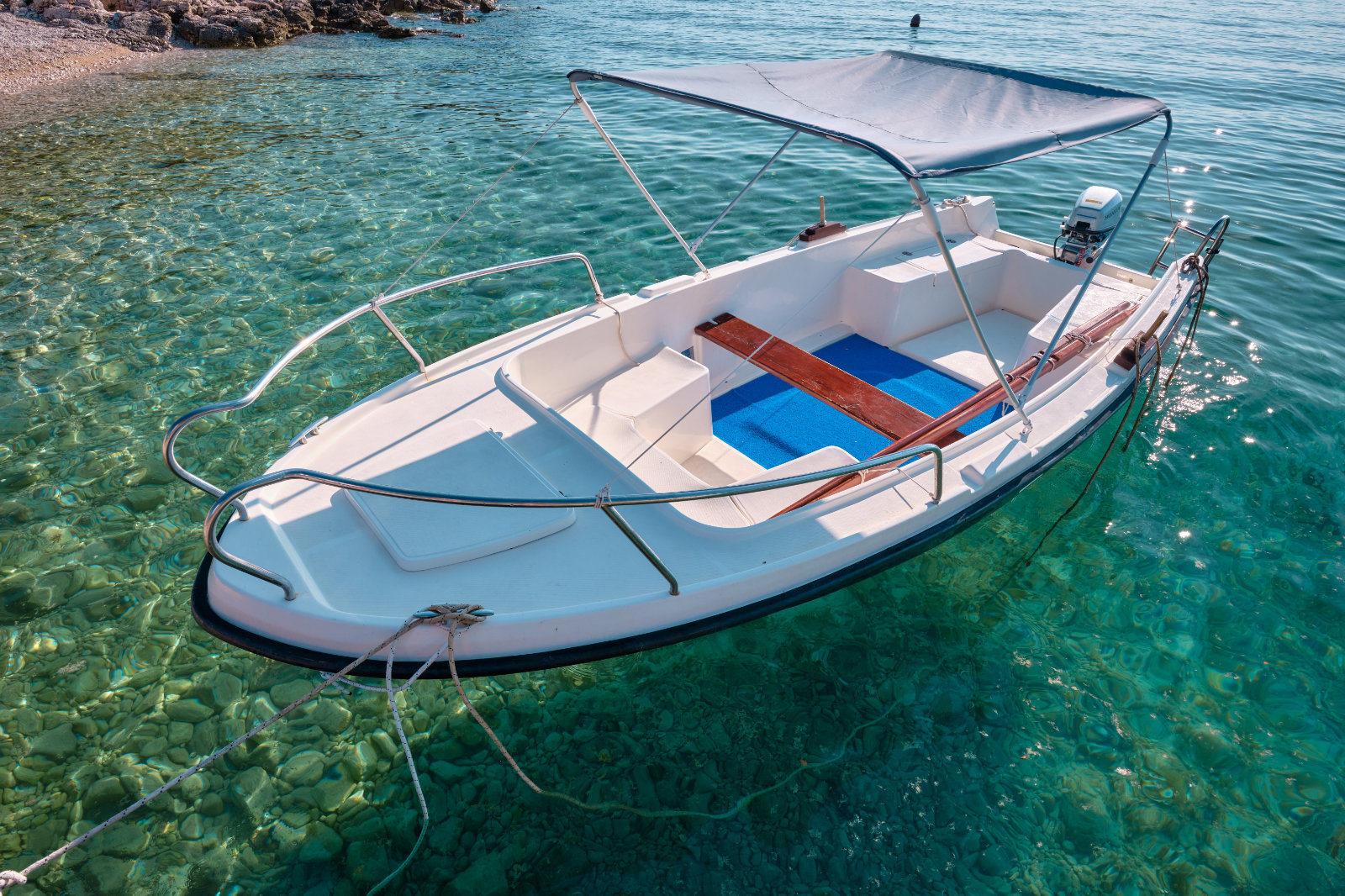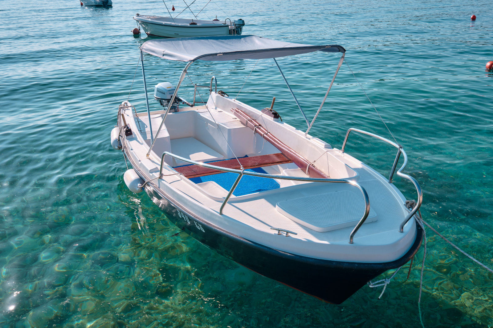 On deck: bimini top, stairs